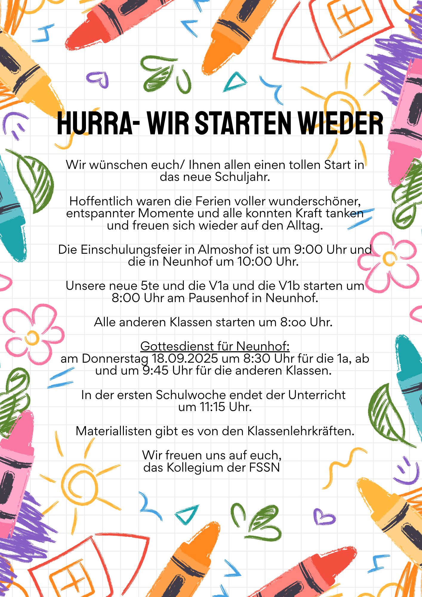 Herzlich willkommen! Wir starten in das Schuljahr 2025/26. Eine Klassenbesetzung wird am Montag 15.09.2025 auf der Homepage veröffentlicht. Der Elternabend für die 1.Klassen findet am Mittwoch 17.09.2025 statt. Weitere Termine werden Sie wie gewohnt im Modul Kalender im Schulmanager finden.