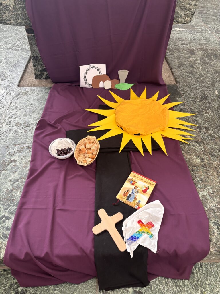 Außerdem betrachteten wir gemeinsam den Kreuzweg Jesu und nahmen die einzelnen Bilder aufmerksam in den Blick. Die Stimmung in der Kirche war ruhig und beinahe festlich. Die Kinder zeigten sich dabei sehr neugierig: Sie hörten aufmerksam zu, stellten viele Fragen und brachten ihre eigenen Gedanken und Eindrücke ein.