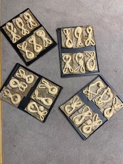 Das Knifflige an der Sache war, die vorher tiefgekühlten Brezen in Osterhasen umzuformen. Zuerst mussten die Brezen antauen und dann in einen langen und ziemlich klebrigen Teigstrang entworren werden. War das geschafft, sollte dieser Strang zu einem Hasen geformt werden…da kamen sehr verschiedene und lustige Häschen heraus. Noch nach Geschmack mit Salz bestreut, kamen sie schließlich in den Ofen – ….mmhhh lecker!!